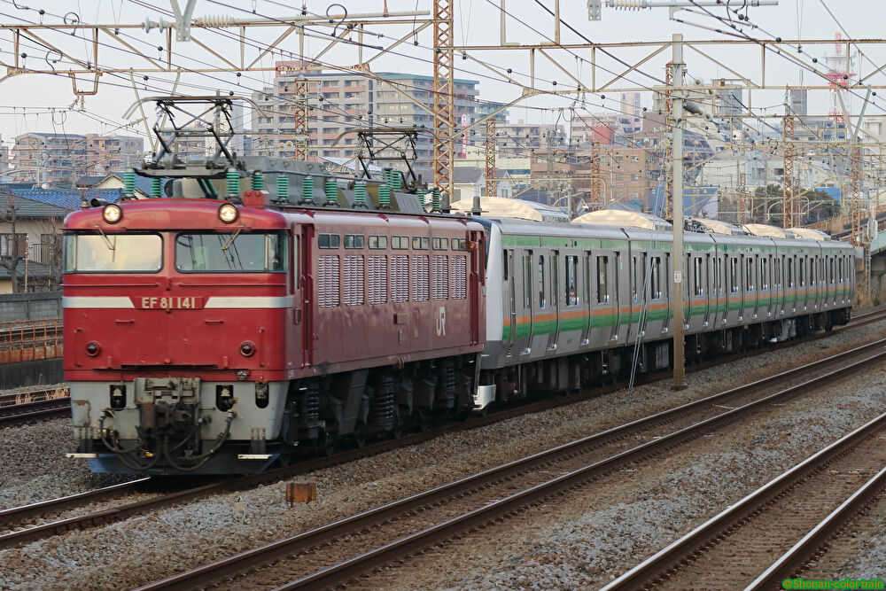【モニタリング装置設置】E233系横コツE-53編成KY出場を撮る!in相模貨物(平塚~大磯間) 2017年02月27日 カテゴリ:撮影記(JR東・配給輸送含む) 本日は、車両の一部の床下に線路モニタリングを搭載するために郡山車両センターへ入場していた、E233系横コツE-53編成のKY出場があったので沿線へ撮影へ行きました。(配〇〇〇〇レ EF81+横コツE233系E-53編成@相模貨物駅付近)東海道貨物線を走る配給輸送自体あまり機会がないので、しっかりと撮れたことが良かったなと思いました。今後も通勤・近郊型の車両にも搭載が進むのでしょうか…?気になりますね。